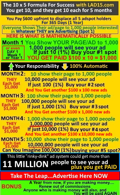 Advertising is the hidden cash cow that sustains google, facebook, you tube, radio, TV, newspapers, magazines, etc. It can sustain you as well. ![]() It may not be the most exciting program out there. We have no rah-rah meetings. It's even a very UGLY website-But the CA$H is pretty :) There are no jewel levels. (Buy whatever jewels or trinkets you like with the cash!) No Minimums. No Monthly Bill. No Upgrades. No OTOs. We only focused on ordinary people using a cooperative, not competitive, environment. Helping people who want to grow their existing Business or Income, or both, and helping those who never even wanted a "business", just more cash to live a more comfortable life. STEP #1: BUY/Post your AD (we even have free examples-if you don't have a biz yet) STEP #2: Expose your page/ad to others (Facebook/Instagram/Twitter/Family/Co-Workers/People who try to sell you, etc) STEP #3: Once you have between 1-10 new advertisers, enjoy your life! :) That's IT. The rest is 100% AUTOMATIC INCOME ! As others help you grow using THEIR favorite methods. NO NEED TO LEARN EVERYTHING! It's all here in our simple Leveraged Advertising & Income System |
